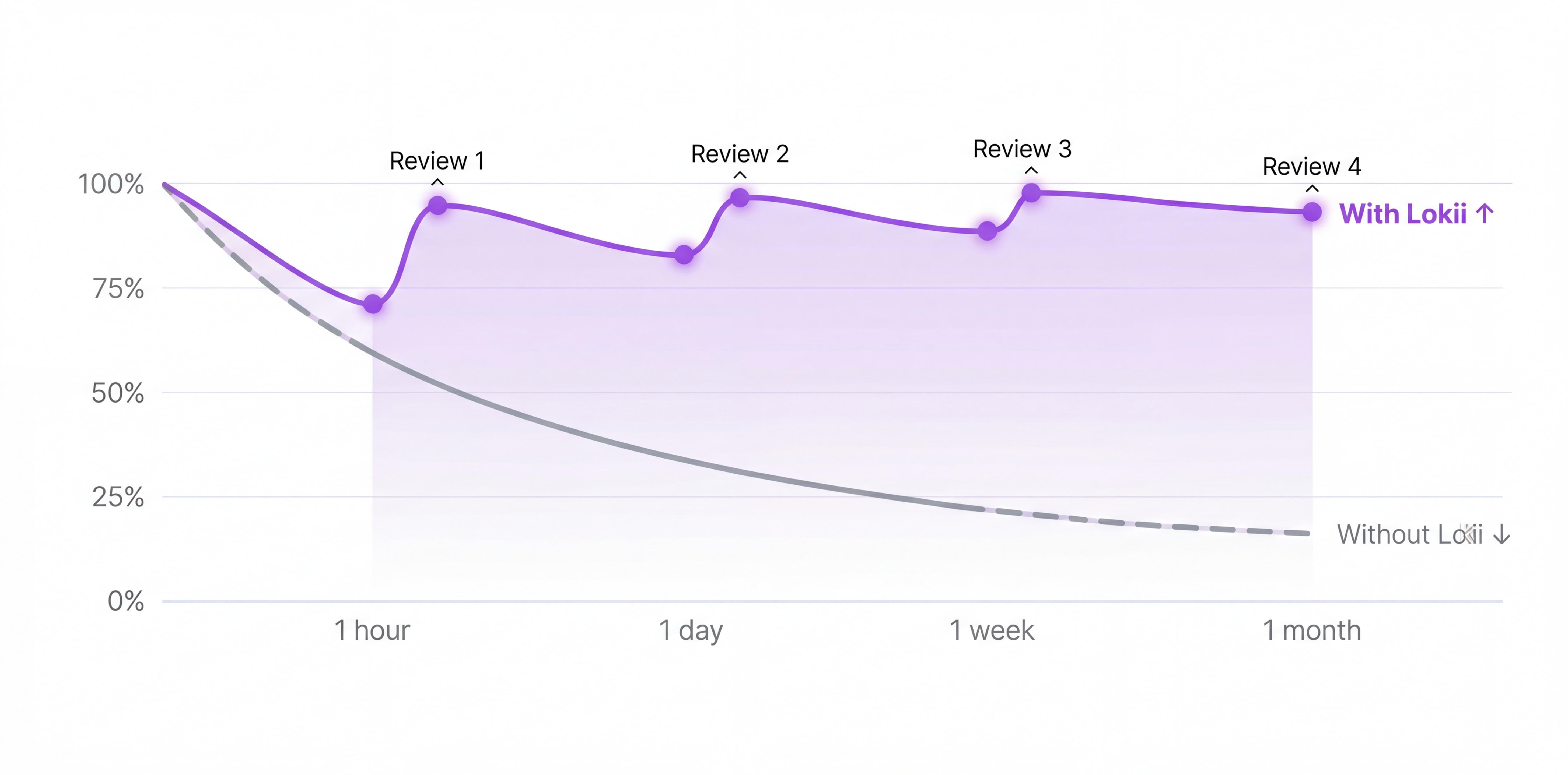 See exactly what you know and what's fading. Lokii tracks your retention curves, predicts when you'll forget, and gives you hard proof that your memory is improving over time.